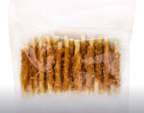 Samenstelling: gedraaide kauwstaaf, omwikkeld met kipfilet